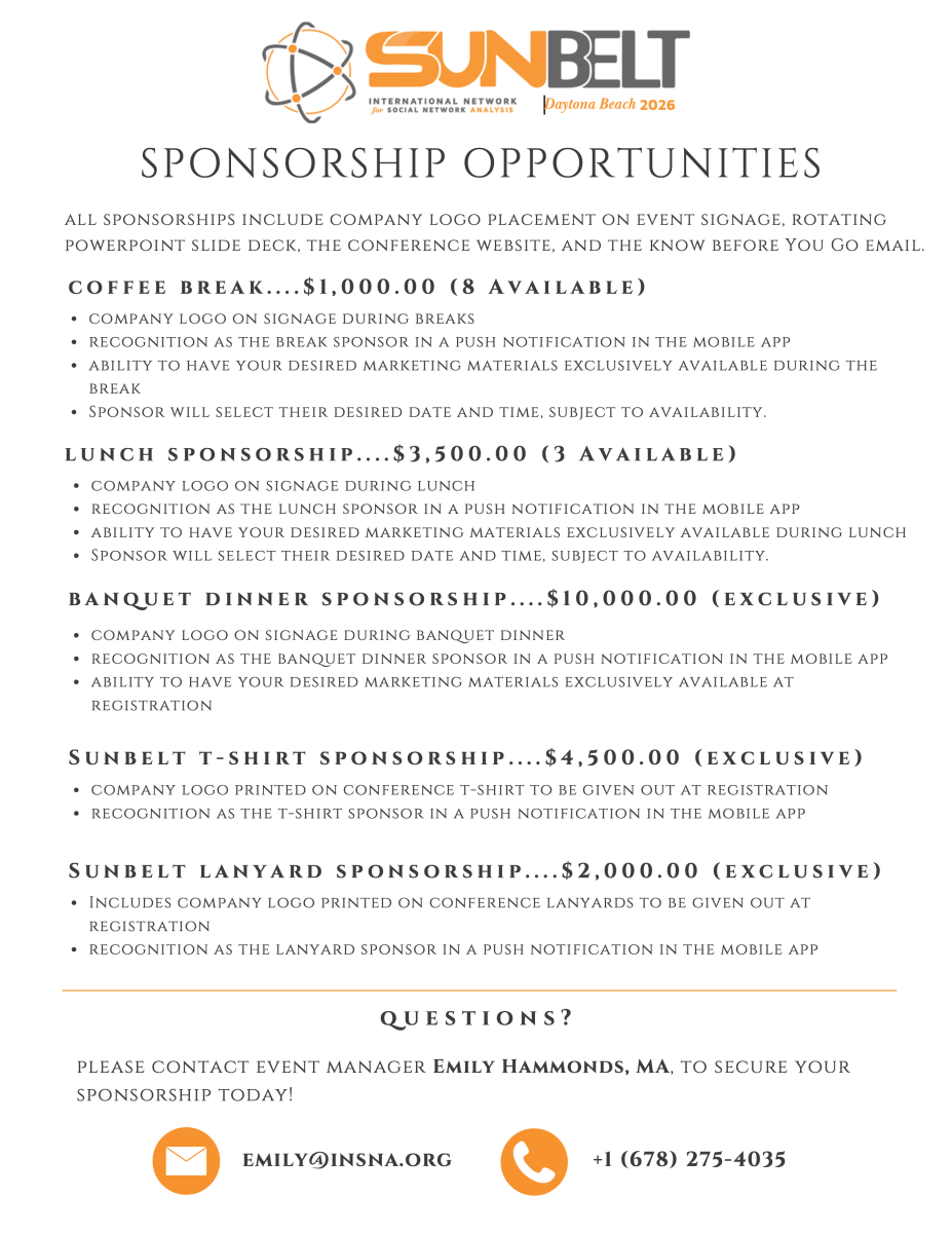If you have any questions about Sunbelt 2026, please reach out to the INSNA Office directly at support@insna.org.